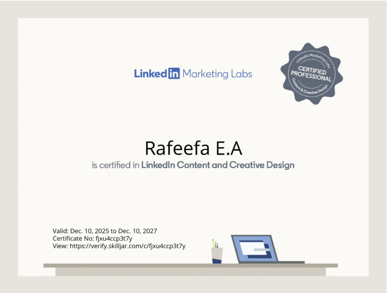 Hey there! I’m Rafeefa — Best Graphic Designer and Digital Marketer in Nilambur,malappuram, with a passion for creativity, color, and connection. I’m currently learning and growing at Digital Curve Academy, where I blend design skills and digital marketing strategies to create meaningful and impactful work. From crafting eye-catching posters to running engaging social media campaigns, I love helping ideas come alive and reach the right audience. My goal is to make every design not just beautiful — but purposeful. When I’m not designing or exploring marketing trends, you’ll find me discovering creative inspirations, learning new tools, and dreaming up my next big idea.